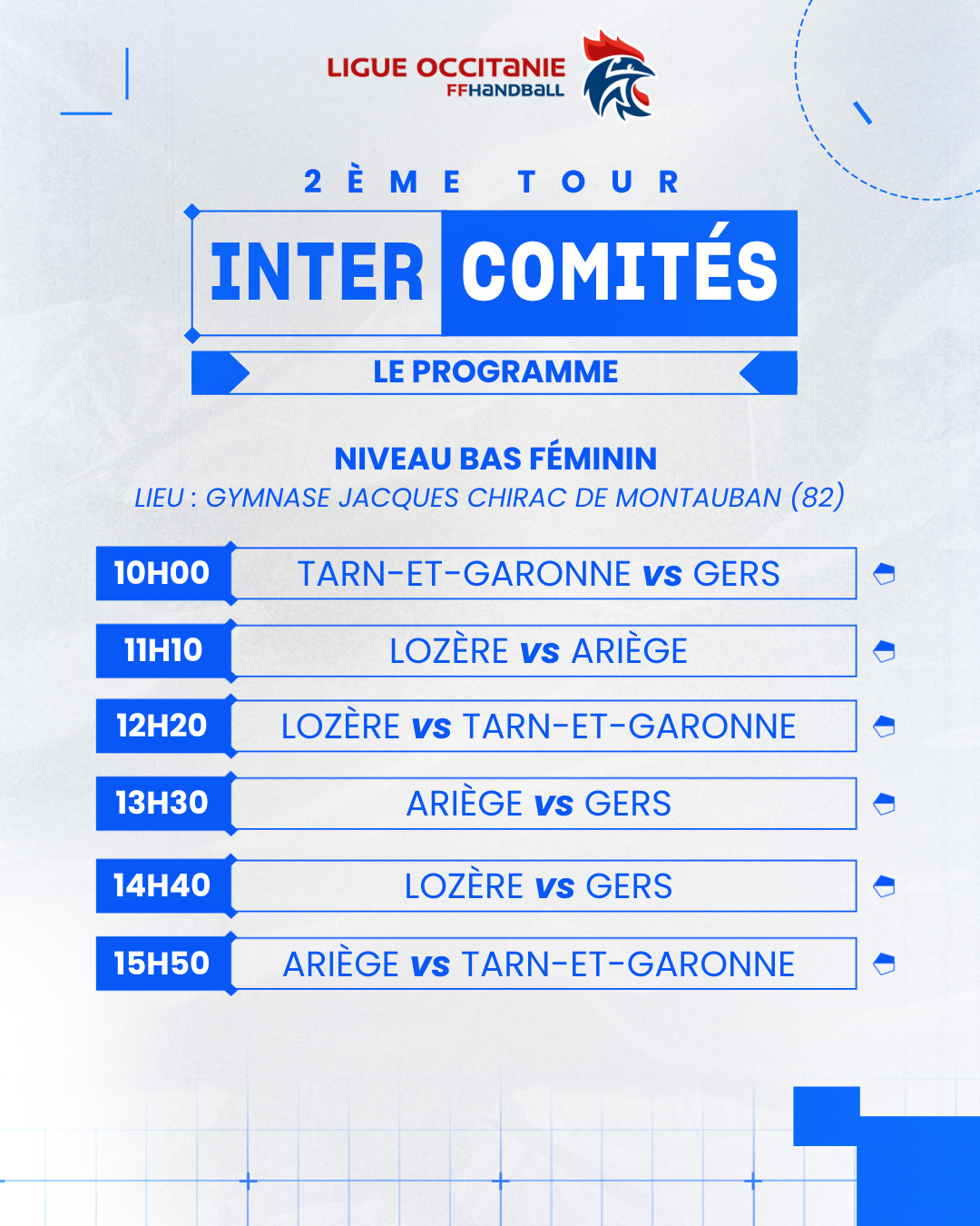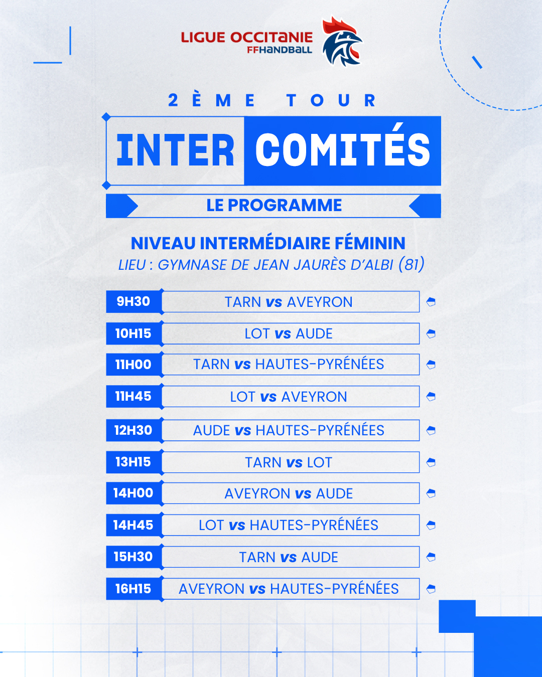Le 2ème tour des Intercomités Régionaux Féminins aura lieu le dimanche 25 janvier 2026 sur 3 sites : Aucamville, Albi et Montauban.