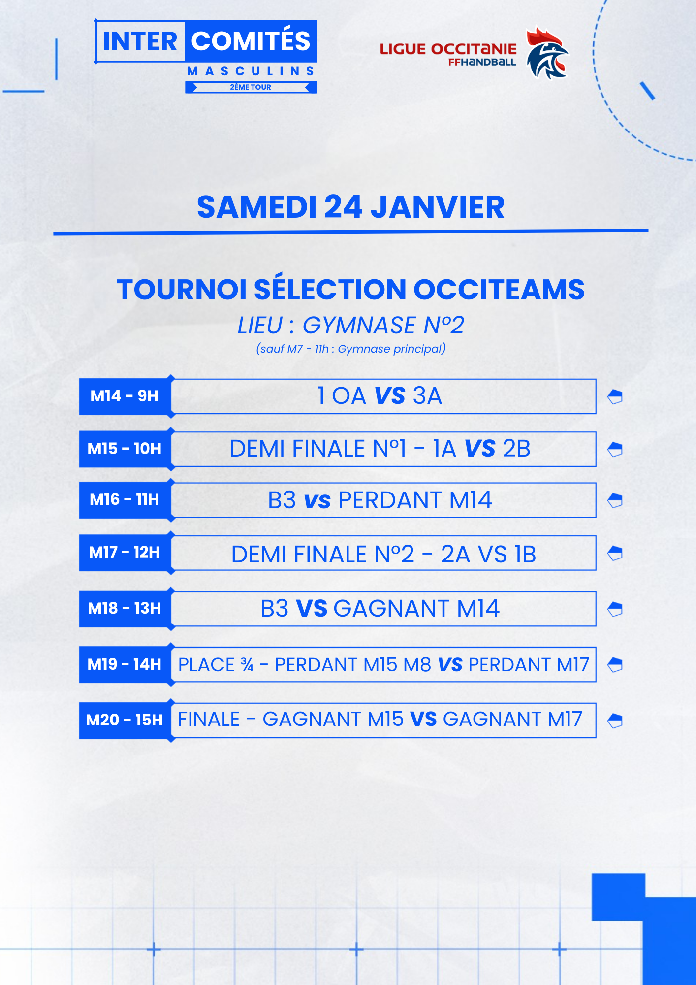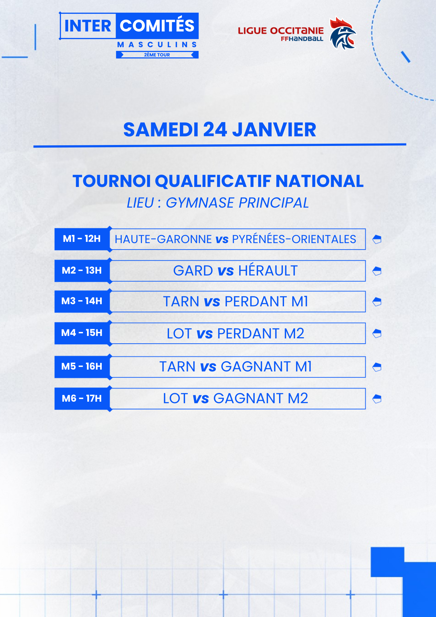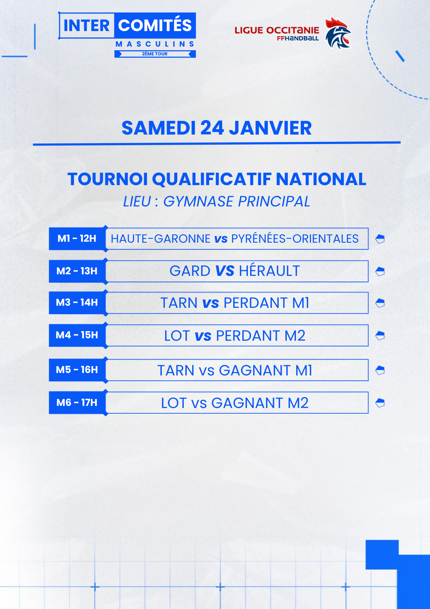La Ligue Occitanie de handball, en collaboration avec le Comité des Pyrénées-Orientales de handball et le club de Rivesaltes, organise le deuxième tour de ses Intercomités régionaux masculins les samedi 24 et dimanche 25 janvier 2026 au complexe municipal de Rivesaltes (Rue Albert Camus 66600 Rivesaltes).
