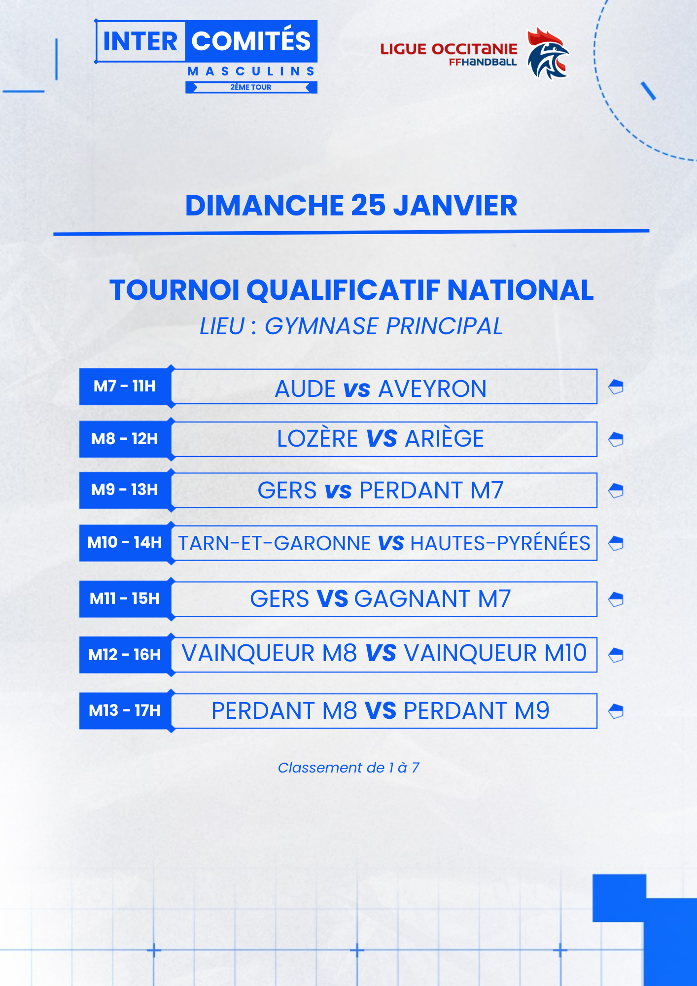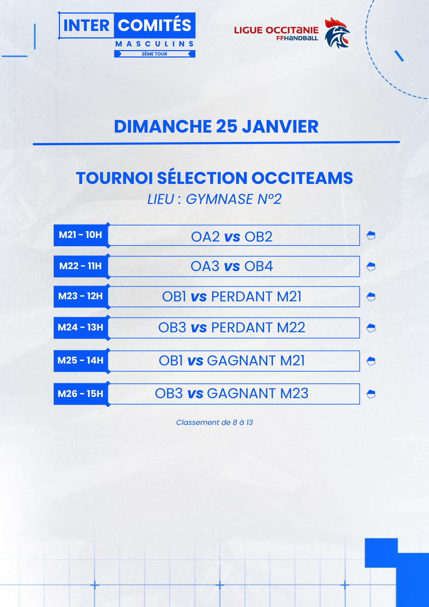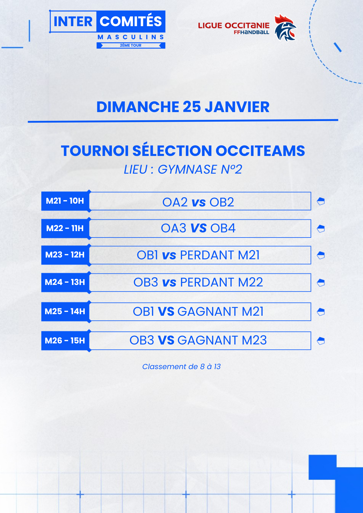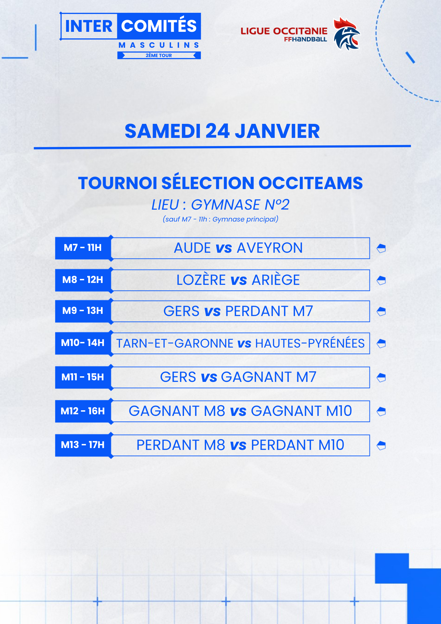 La Ligue Occitanie de handball, en collaboration avec le Comité des Pyrénées-Orientales de handball et le club de Rivesaltes, organise le deuxième tour de ses Intercomités régionaux masculins les samedi 24 et dimanche 25 janvier 2026 au complexe municipal de Rivesaltes (Rue Albert Camus 66600 Rivesaltes).